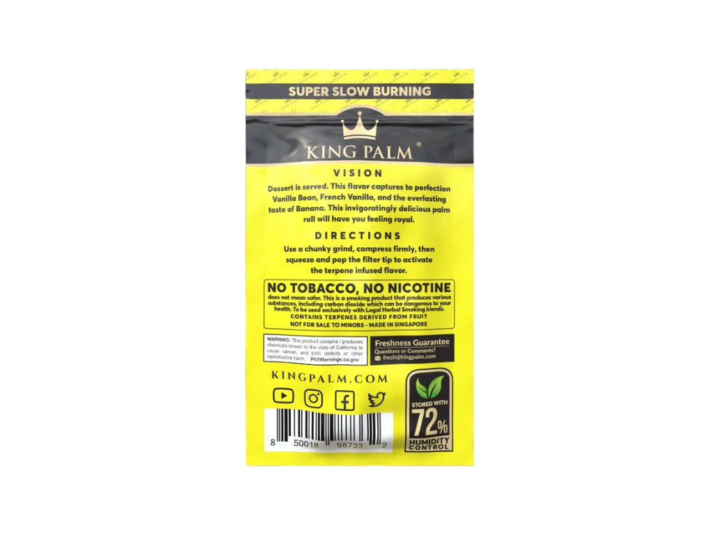 King Palm blunty jsou revoluční alternativou ke klasickým ochuceným bluntům a balicím papírkům. Vyrobeny z přírodních, 100% organických palmových listů, neobsahují tabák ani chemické přísady. Každý blunt je vybaven unikátním kukuřičným filtrem s kapslí naplněnou přírodními terpeny, které po zmáčknutí uvolní jedinečnou příchuť. Nabízejí pomalé hoření a hladký tah. Filtr z kukuřičného vlákna navíc chladí kouř, což zajišťuje hladší a jemnější pocit v ústech i v plicích.