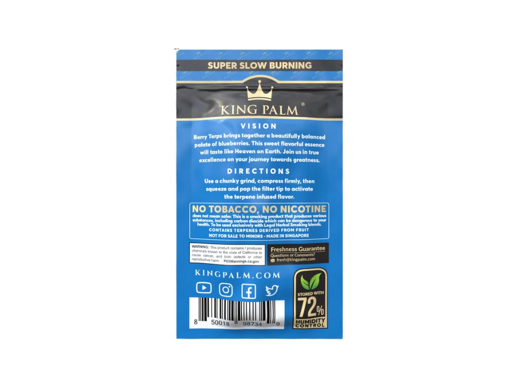 King Palm blunty jsou revoluční alternativou ke klasickým ochuceným bluntům a balicím papírkům. Vyrobeny z přírodních, 100% organických palmových listů, neobsahují tabák ani chemické přísady. Každý blunt je vybaven unikátním kukuřičným filtrem s kapslí naplněnou přírodními terpeny, které po zmáčknutí uvolní jedinečnou příchuť. Nabízejí pomalé hoření a hladký tah. Filtr z kukuřičného vlákna navíc chladí kouř, což zajišťuje hladší a jemnější pocit v ústech i v plicích.